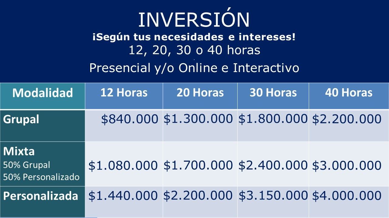 Los horarios e inversión se definen de acuerdo a tu disponibilidad y expectativas.
